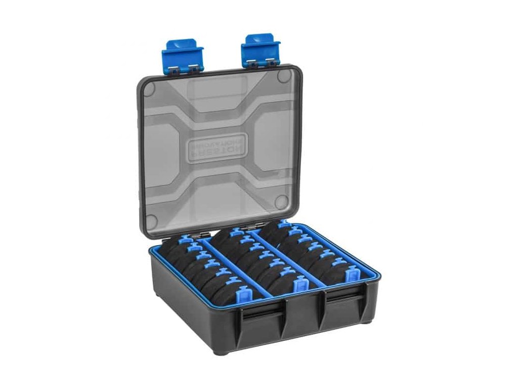 Preston Revalution storage box egy olyan előketartó rendszer, mely tartalmaz 21 EVA előketartó korongot. A korongok előnye, hogy bármilyen hosszú horogelőke tárolható rajta anélkül, hogy az előkét a hagyományos előketartóknál alkalmazott tüskén kellene visszafordítani, vagy megtörni. Az előkéket egymásba akasztva egy korongon több is tárolható. Az utolsó előkét nem kell külön beszúróval rögzíteni, a korong oldalán található elfordítható műanyag tüskébe akasztva biztonságosan tárolhatjuk előkéinket.