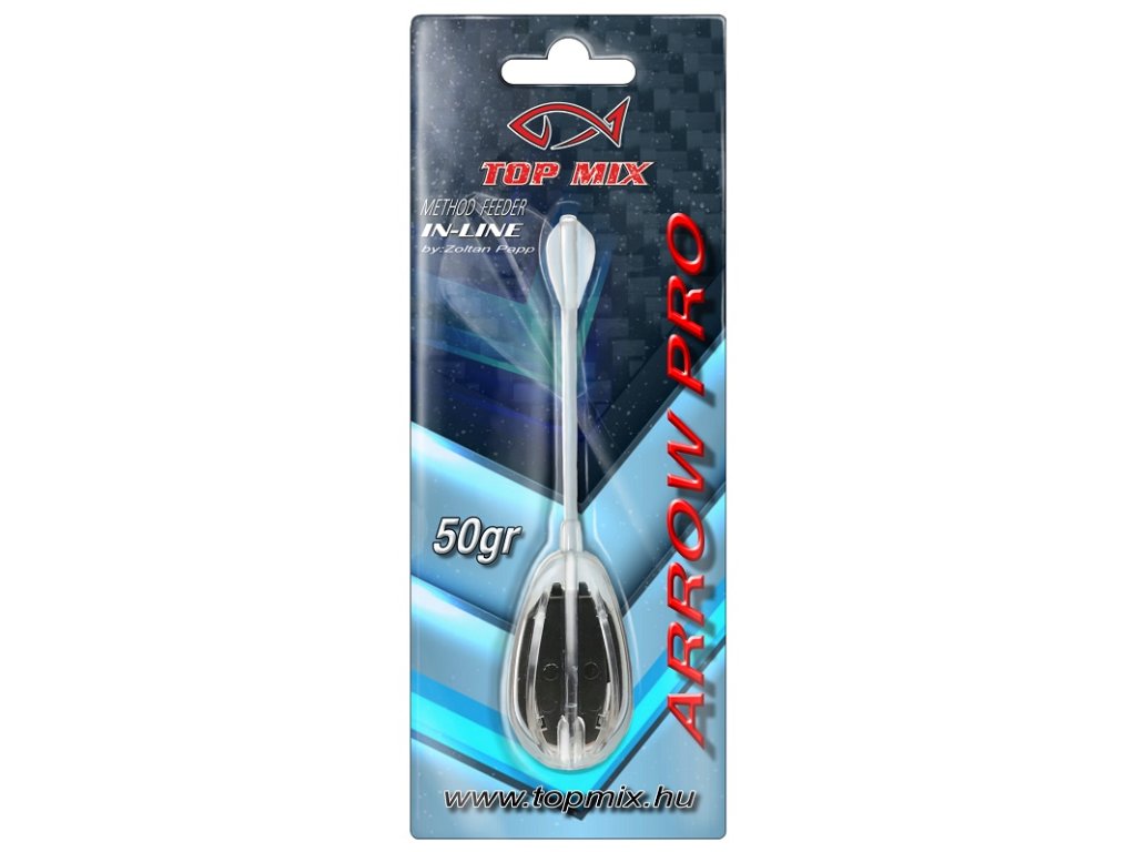 A TOP MIX legújabb, egyedileg tervezett method feeder kosara, a hosszanti bordás method feeder kosár család, melynek kifejlesztéséhez a legmodernebb 3D nyomtatási technológia lett alkalmazva. Az ARROW PRO method kosáron hosszanti irányban elhelyezkedő bordák kiválóan megtartják az etetőanyagot, megfelelő helyet biztosítanak a csalinak és csökkentik a horog elakadás lehetőségét. Az előretolt súlypont, a súly kialakítása, formája, az eddigi kosarakhoz képest a legáramvonalasabb kialakítás. A hosszabb szár és a száron lévő vezető szárny kiváló repülést, távoli és pontos dobásokat biztosít a method kosárnak. A kialakítása miatt a vízbe éréskori csobbanás hangja is csökkent. A kosár alján kialakított kapaszkodó bütykök pedig a fenéken a csúszásmentességet biztosítják a kosárnak. A horgászok igényeinek megfelelően, a method kosarak a szerelék megbontása nélkül a zsinórról egy pillanat alatt levehetők, cserélhetők. Nagy szabadságot biztosítva, szállításhoz, vagy a különböző súlyú method kosarak variálásához. Az etetőanyagot tartó kosár felső részének gyártásához, 50 %-ban újrahasznosított, fluoroclear alapanyagot használtunk.