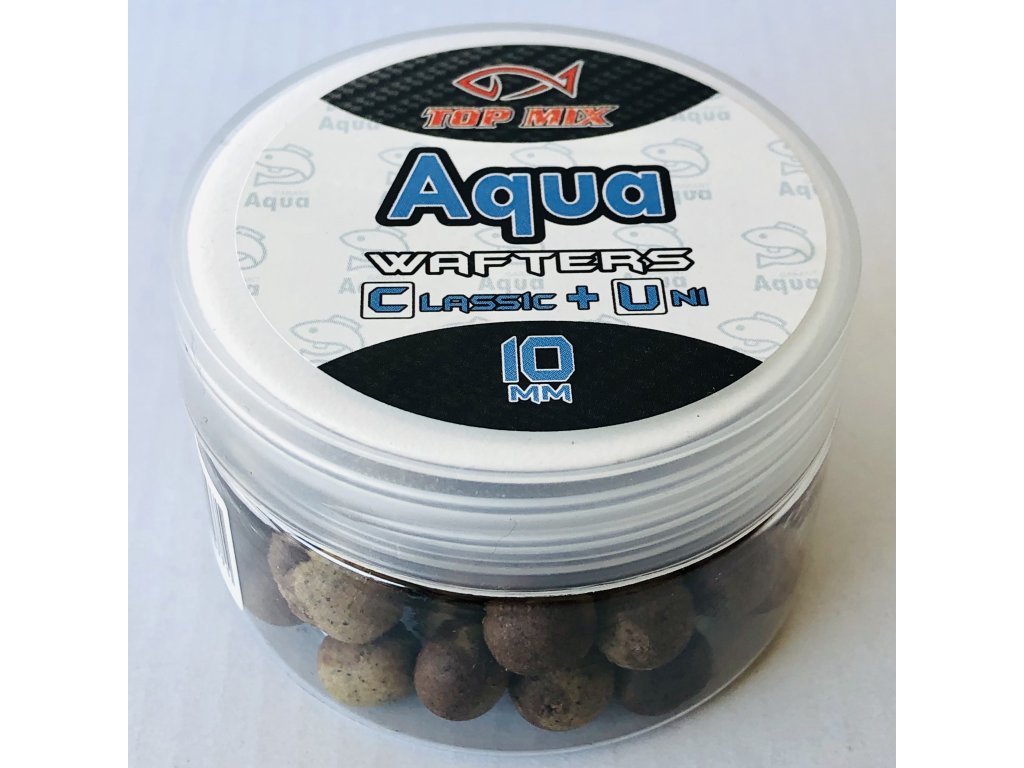 A Top Mix Aqua wafters termékcsalád tagjai azoknak a feeder horgászoknak készültek, akik szeretik az attraktív oldódó csalikat. Kikönnyített pelletek, de épp csak annyira, hogy fine tüske mellett #14 horgokkal is használhatók legyenek a legkisebb, 8-as méretek. 8mm és 10mm-es méretekben kapható minden íz. Oldódási képessége intenzív, "nyitott csali", hogy az aroma mellett beltartalmi értéke is csalogassa az oda tévedő halakat. Alapanyaga magas százalékban tartalmaz Aqua Garant Classic és Uni pellet őrleményt.
