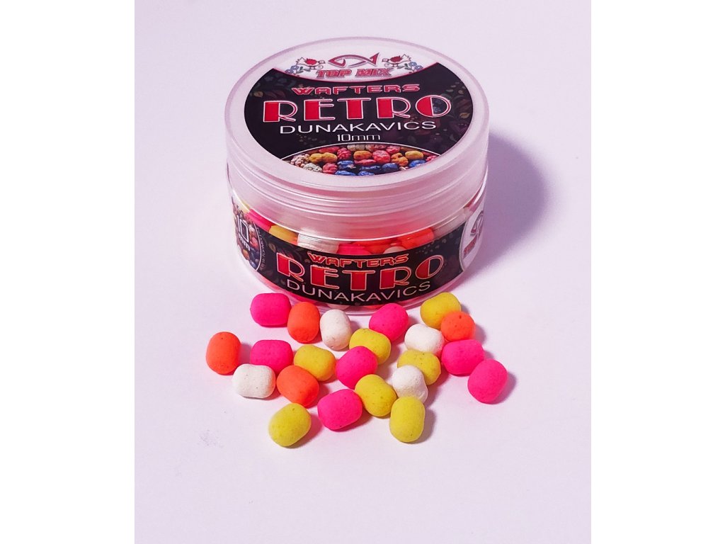 A Top Mix Retro wafters termékcsalád tagjai azoknak a feeder horgászoknak készültek, akik szeretik az attraktív oldódó csalikat. Kikönnyített pelletek, de épp csak annyira, hogy fine tüske mellett #14 horgokkal is használhatók legyenek a legkisebb, 8-as méretek. 8mm és 10mm méretekben kapható minden íz. Oldódási képessége intenzív, "nyitott csali", hogy az aroma mellett beltartalmi értéke is csalogassa az oda tévedő halakat. Retro ízviláguk visszatekintés a 2000. év előtti időszak klasszikus aromáira.